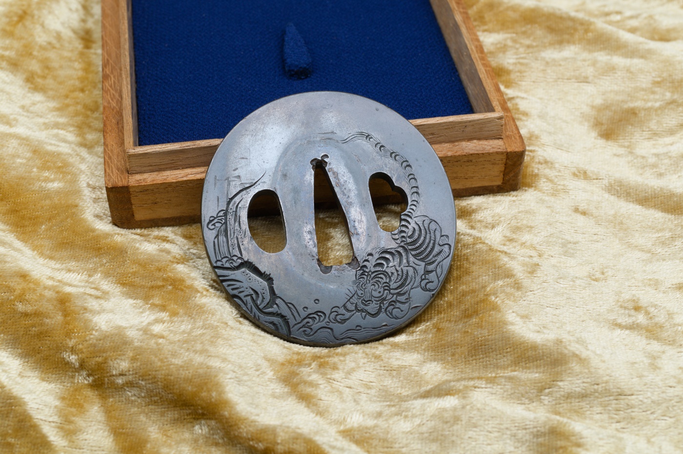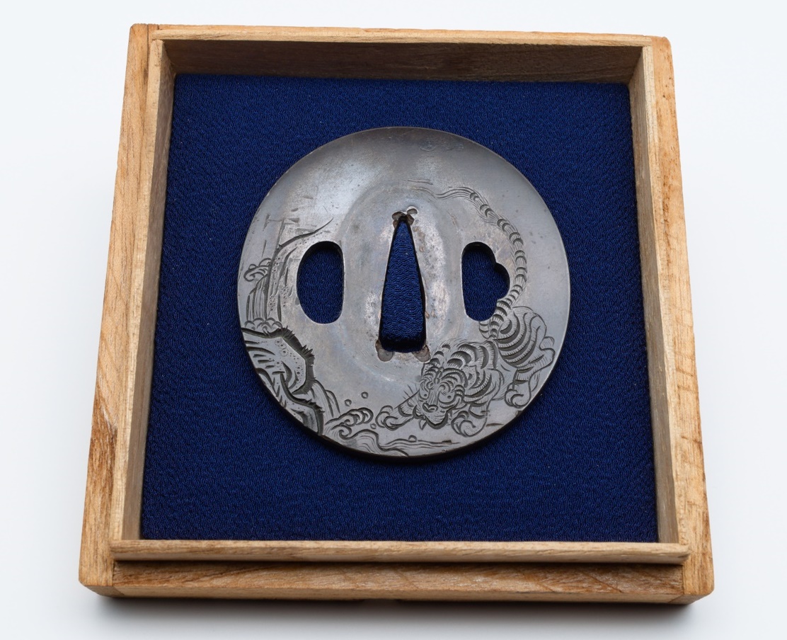 Tsuba made in Shibuichi with high-quality Kebori and katakiri-bori work depicting a tiger.