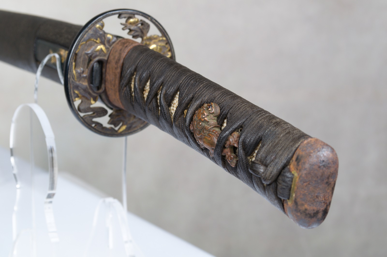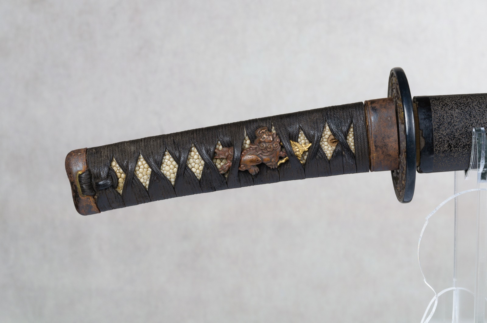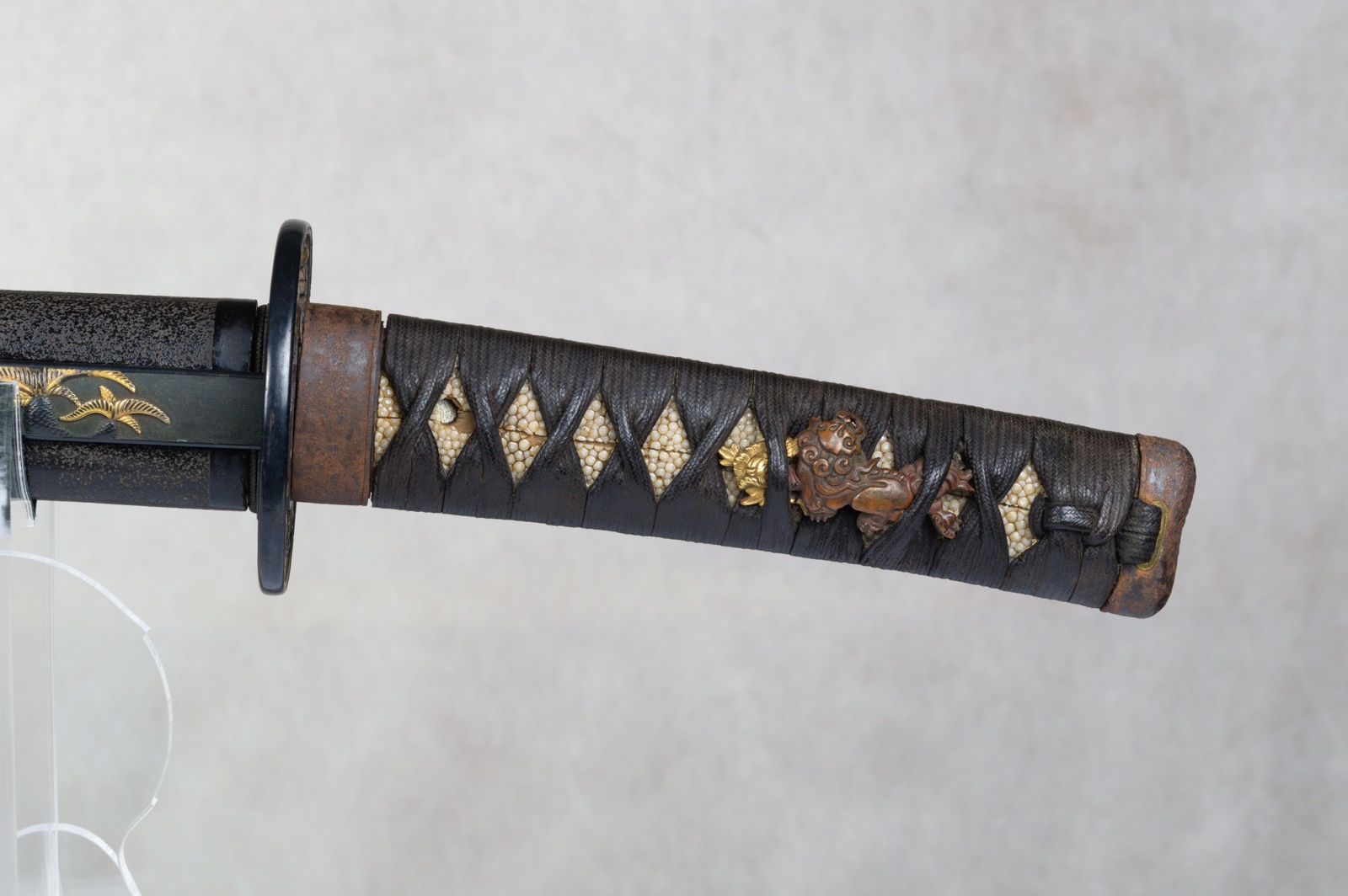 The tsuba, also featuring the Shishi lion, is made of iron with a shakudo fukurin, an openwork design with gilt decoration.