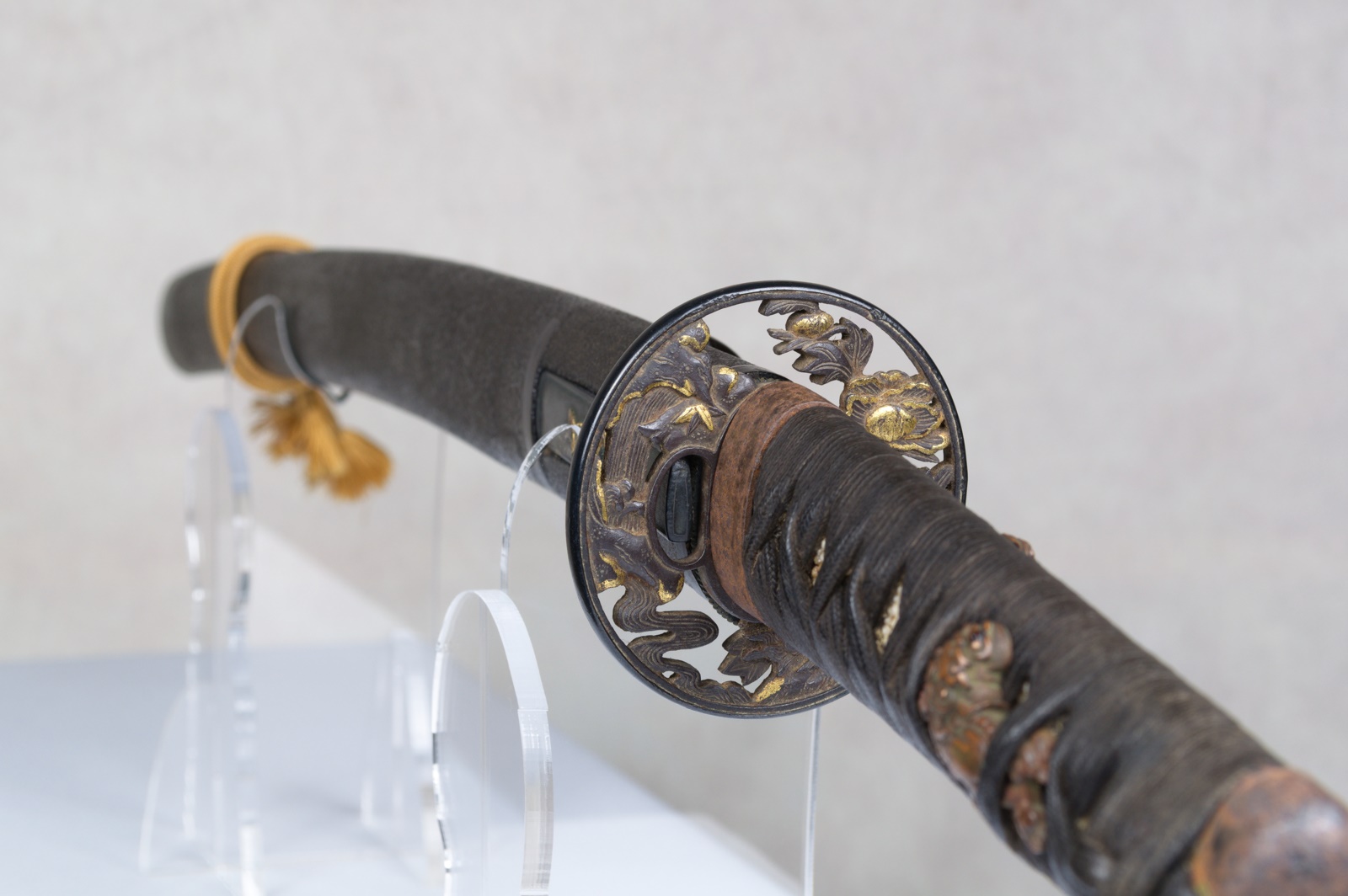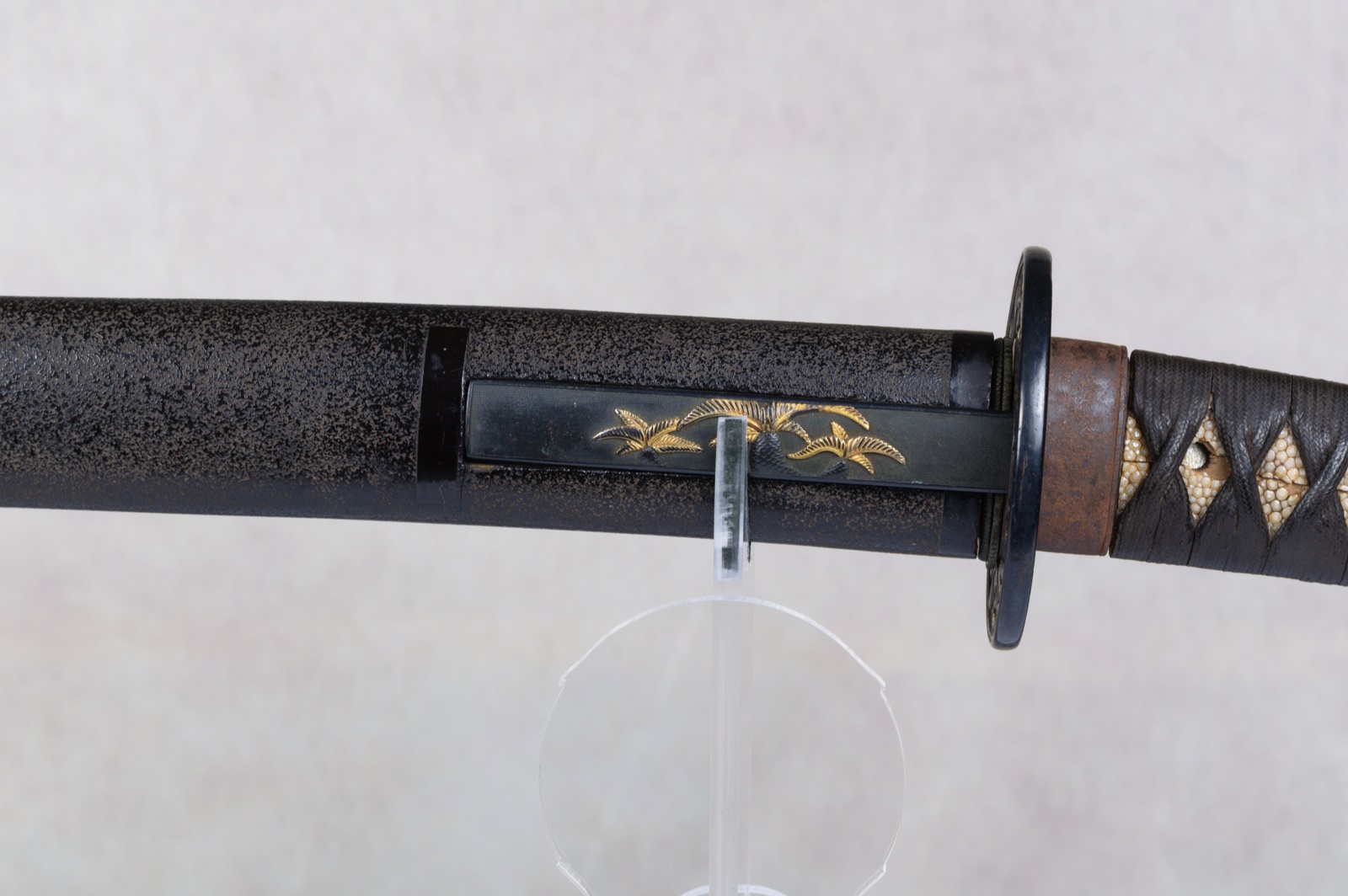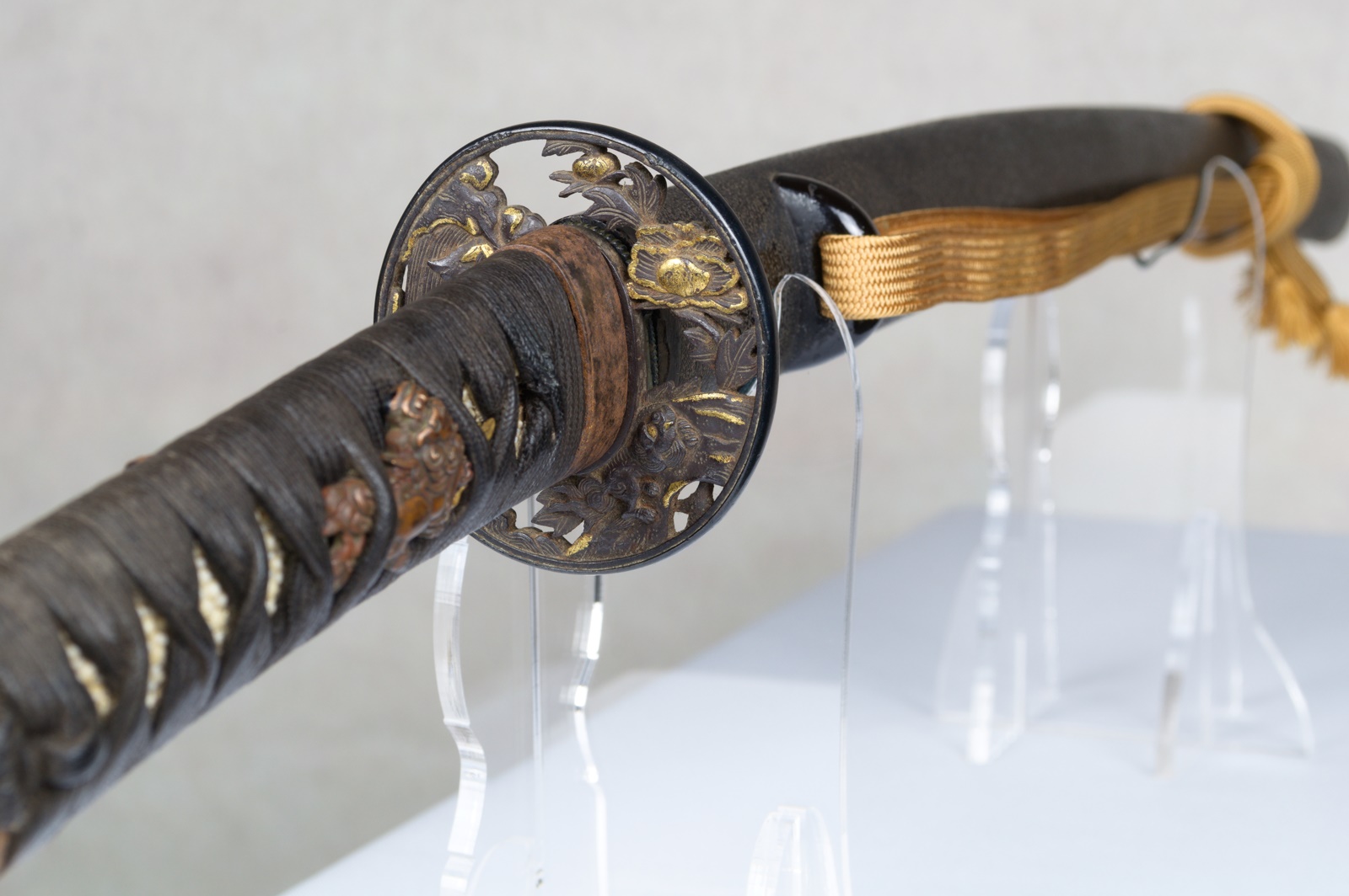 The tsuba, also featuring the Shishi lion, is made of iron with a shakudo fukurin, an openwork design with gilt decoration.