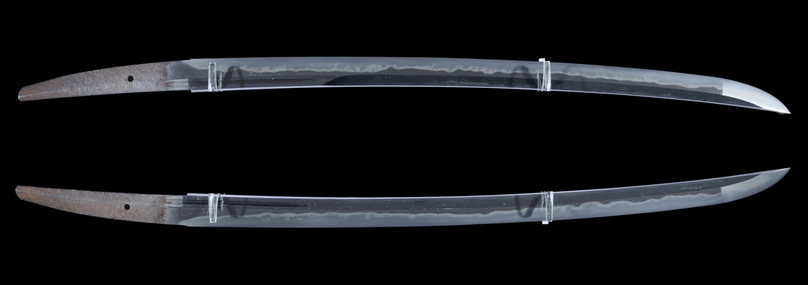Superb ubu (unshortened) blade, signed, in perfect condition, and crafted in a beautiful and rare sugata (shape) with a thickness that tapers towards the shinogi-ji on the omote side. High-quality horimono, shaped like grooves, are present on both sides of the first section of the blade.