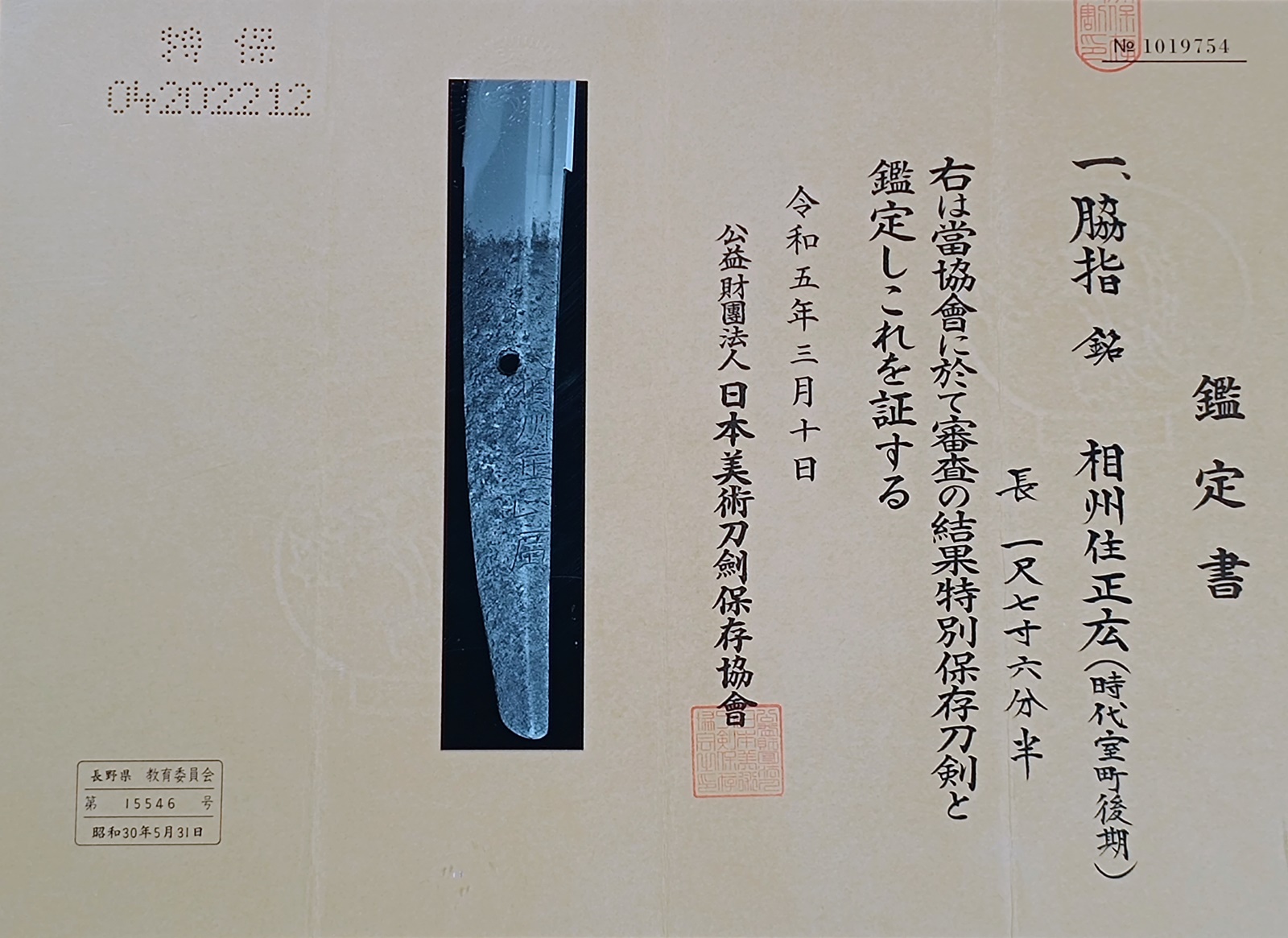 NBTHK Tokubetsu Hozon Certificate