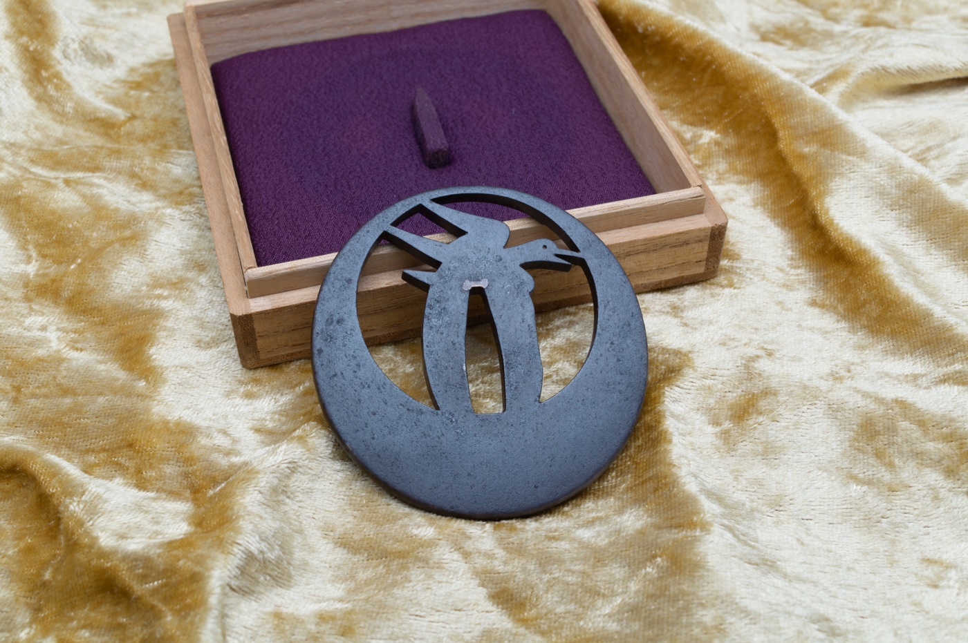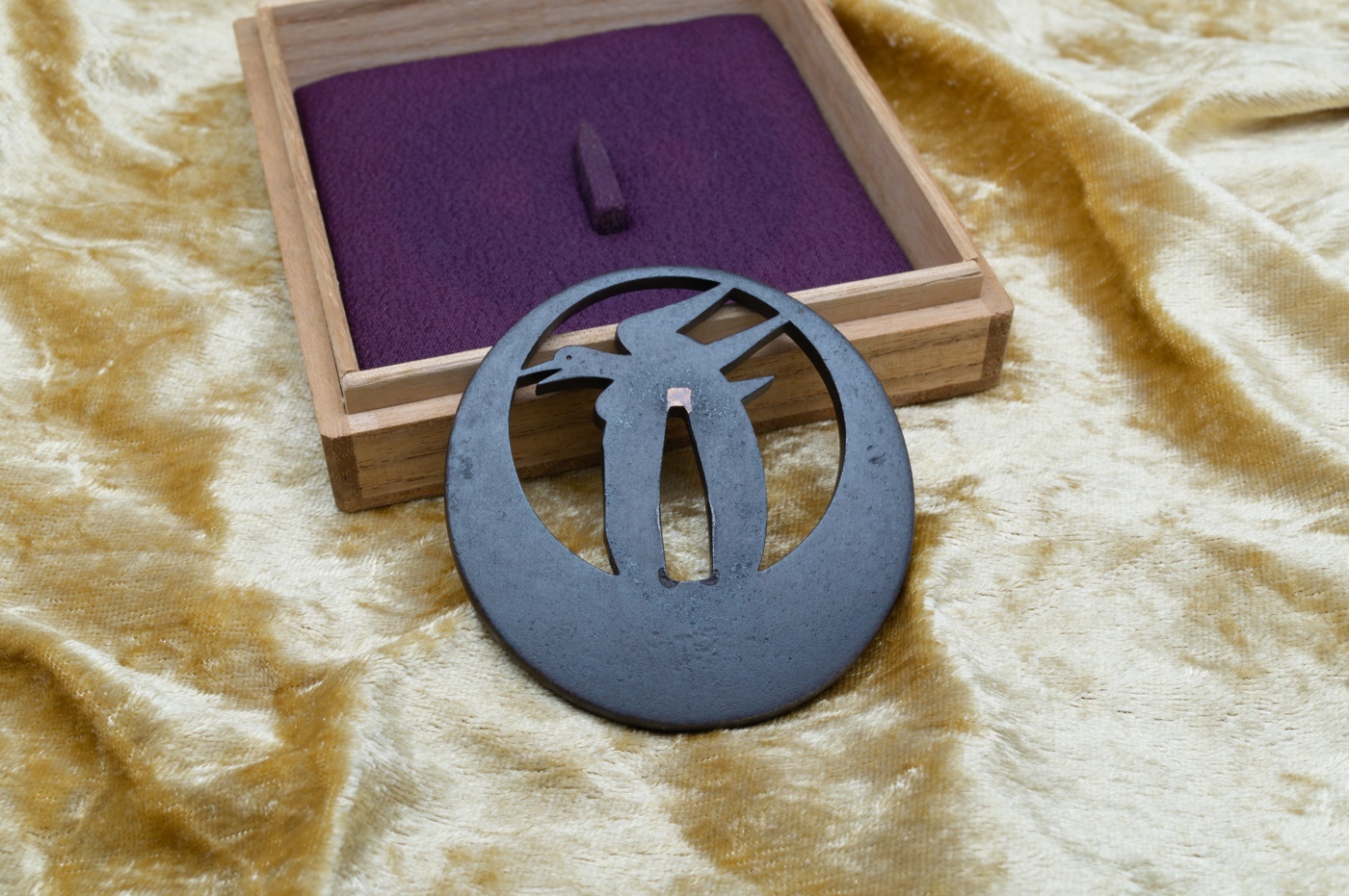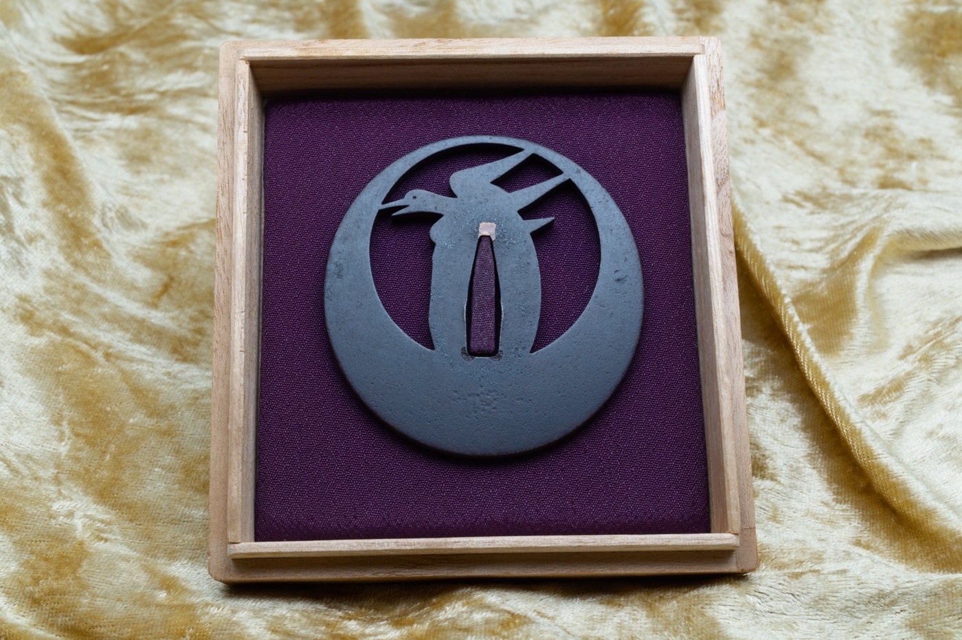 Belle réalisation en sukashi (ajouré) représentant un oiseau japonais appelé chidori sur une pleine lune en arrière plan.